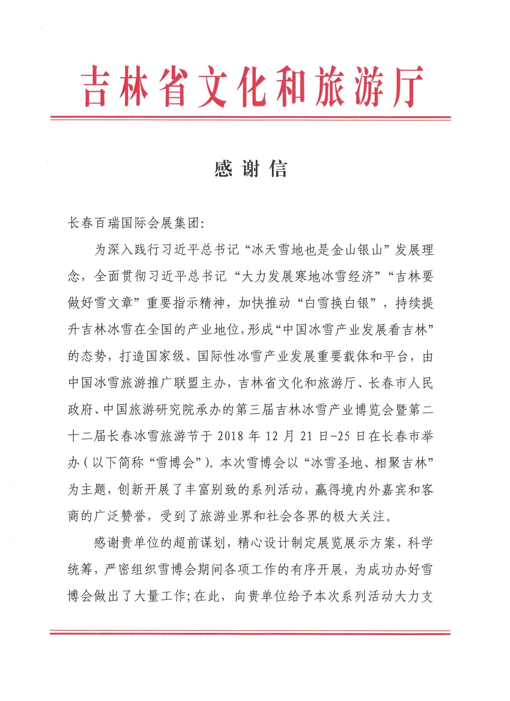 長春百瑞收到來自吉林省文化和旅游廳的表揚信