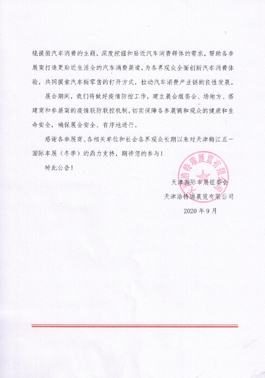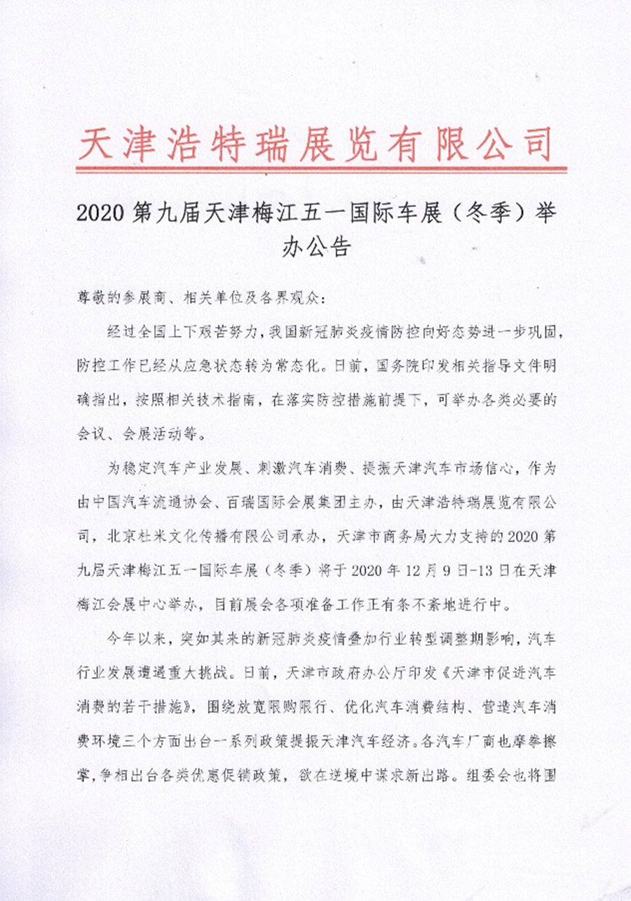 為穩(wěn)定汽車產(chǎn)業(yè)發(fā)展、刺激汽車消費、提振天津汽車市場信心,作為由中國汽車流通協(xié)會、百瑞國際會展集團主辦,天津浩特瑞展覽有限公司、北京杜米文化傳播有限公司承辦,天津市商務(wù)局大力支持的2020第九屆天津梅江五一國際車展(冬季)(以下簡稱“天津車展”)將于2020年12月9日-13日在天津梅江會展中心舉辦。本屆車展以“提振汽車消費?暢享美好生活”為主題,旨在引領(lǐng)汽車未來,展示汽車文化,促進汽車消費,拉動經(jīng)濟增長。